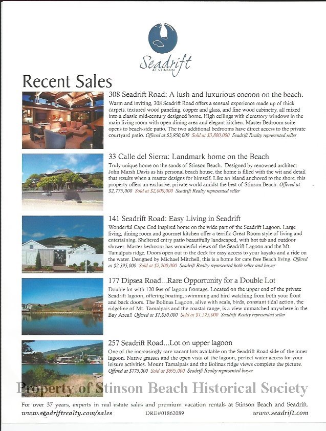 A flyer by Seadrift Co. Realty of five recent sales consisting of two parcels in Seadrift, two houses in Seadrift and one house on Calle del Sierra