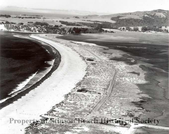 Overview of Seadrift Sandspit where the first houses are visible. We see the sandy beach on the left of the spit and the shallow lagoon on the right. The sandspit is sparsely vegetated and has a dirt road traversing the middle. There is one house at the beginning turn of the road, a second on the left side down a short way, and a third, also on the left side of the road further down. The contours of Bolinas are visible on the far side.