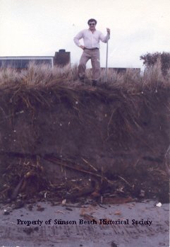 A colored photograph of a man standing at the top of the cliff about 10 ft high created by the erosion of the sand by the storm wave action. Two houses are seen in the back of the man who hold a stick probably the handle of shovel. Written on the back: "Cliff" in front of 292 Seadrift.