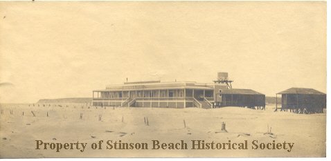 An original black and white photographic print of Dipsea Inn by Edgar A. Cohen. Shows the Dipsea Inn and 2 cottages as stood on Sandspit of Stinson Beach. Bolinas Mesa and surf in background, sandy beach with posts (Property mark?) in front. On the back: Photographs(stamped) #1828 Dipsea (written in pencil) Edgar A. Cohen, Alameda, Cal. (stamped)