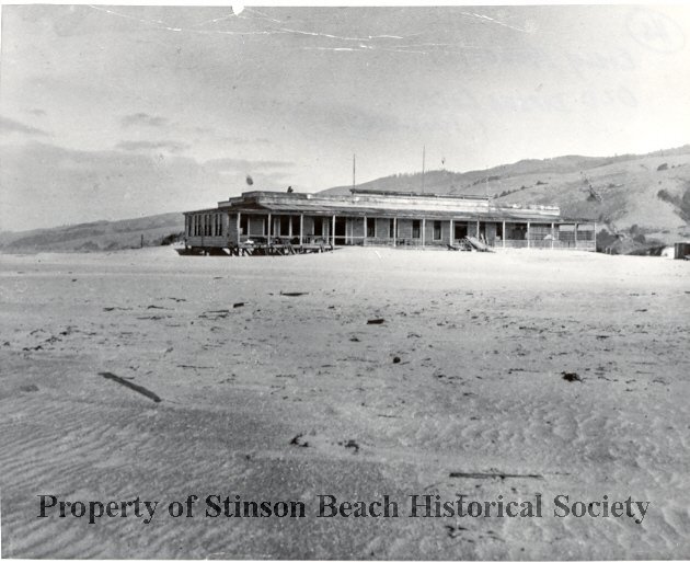 This black and white photograph shows a long,low building with many windows and a porch running the length of it. There are hills in the background and a sandy beach in front. The photo is of the Dipsea Inn in early 1900s.(1905-06). It was built in 1904 and torn down in 1918. It was located on the sand spit near the causeway.