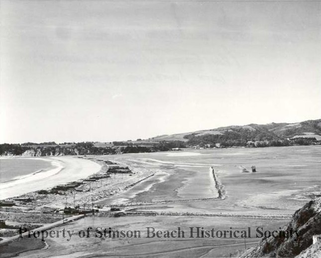 A black and white photograph of the area of Bolinas Lagoon being filled in order to create Dipsea Rd. and Seadrift Lagoon at the beginning of the project. There is a dredge in the right mid-ground. The causeway between Highway 1 and Seadrift is visible in the foreground.
