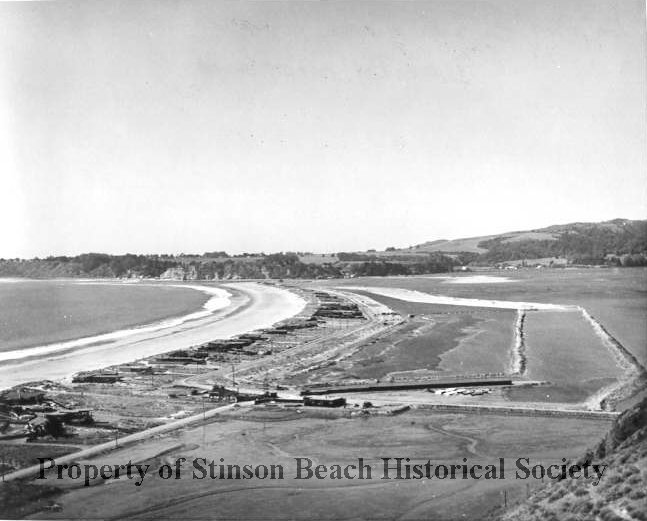 A black and white photograph of the area of Bolinas Lagoon in the process of being filled in in order to create Dipsea Rd. and the Seadrift Lagoon. Part of the causeway between Highway 1 and Seadrift is visible .
