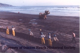 See 2004-100-07. In this picture the group of the Calif. Conservation Corps workers are holding up a long piece of drift fence probably to stop further tidal erosion at the heal of the slope. A bulldozer is moving along the surf.