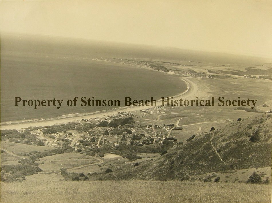 Westerly overview from mountain side with Stinson Beach below, Bolinas and Duxbury Reef stretching into the distance. Downtown identifiable buildings are Airey's Store and some houses in the Highlands. Buildings in present park, Sea Downs, Dipsea Lodge, old library and others occupied by military (perhaps) are also identifiable. See notes.