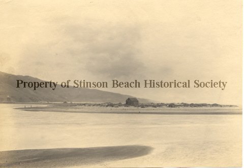 An original black and white photograph by Edgar A. Cohen, of Sand Spit taken from Bolinas. On the sand spit stands a boatman's shack and a tall oat house. Dipsea Inn is in far distance. The lagoon curves around the spit beneath hills and sky with its hint of darkening clouds. In foreground, the sand bar of Bolinas juts out. On its back: 5/31/04 - 5.40PM (penciled) Photograph (stamped), #1830 Bolinas Sand Spit from road to Bolinas Wharf (penciled), Edgar A. Cohen, Alameda, Cal. (stamped)