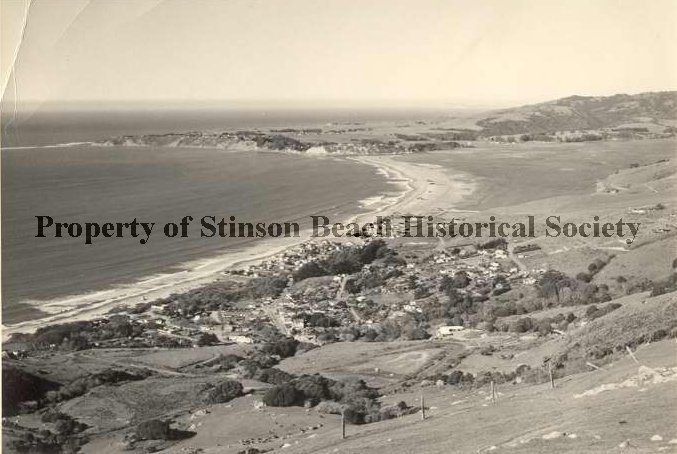 This original black and white photograph, taken from a hillside above Stinson Beach, shows the town of Stinson Beach in the middle ground of the picture with Bolinas Bay on the left and Bolinas Lagoon in the right upper quadrant with Bolinas Penninsula and hills behind them. There is a fence running from the mid-foreground to the right.