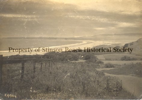 An original photographic print by Edgar A. Cohen with his signature in white at lower left corner. It shows a panoramic view of Stinson Beach from above, near Panoramic Highway. We see sky, Bolinas, wisp of fog over Bolinas, and Stinson Beach in middle and background. The foreground hill has barbed wire fence marking Rancho Bolinas and Rancho Sausalito border. In the right foreground there appears to be a trail leading down among cleared land. The few town buildings include Easkoot's's barn and Dipsea Inn on far sand spit. On the back:#1615 (penciled) Photograph(stamped) Willow Camp, Dipsea, Bolinas Bay, Duxbury, Point Reyes, etc.(penciled) Edgar A. Cohen , Alameda, Cal. (Stamped)