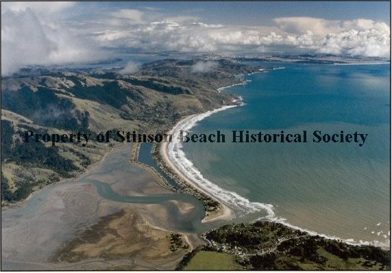 Aerial photograph postcard of Stinson Beach and Bolinas Lagoon from the tip of Bolinas Mesa to San Francisco. The hills behind the Beach and Marin Headland are also shown. White thunder clouds float on top of all. It reads on the back; Stinson Beach /Bolinas Lagoon Photo by Robert Campbell Greater Bay Aerials P.O.Box 714, Sonoma, Ca 95476-0714. On The Edge of both North American and Pacific plates. Bolinas Lagoon sits atop the San Andreas Fault, illustrating the geologic principle of plate tectonics. Taken at low tide, this dramatic view looks out over Bolinas and Stinson Beach to Marin Headlands, the Golden Gate and San Francisco.
