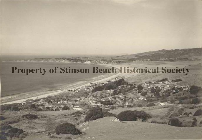 This original black and white photograph is a panoramic view of Stinson Beach, taken in 1951, from White Gate Ranch, or above existing houses of Panoramic Hwy. It shows the sweep of sandy shore of Bolinas Bay on the left with Bolinas Lagoon on the right and Bolinas Mesa at the horizon. Point Reyes shows faintly, in the mid background, jutting out into the ocean behind Bolinas ridge. The houses of the town can be seen in the mid foreground including the hill houses, no development on Highlands, the downtown area and the Calles and Patios. The sand spit is undeveloped at this time. Tree and rock strewn hills are in the foreground.