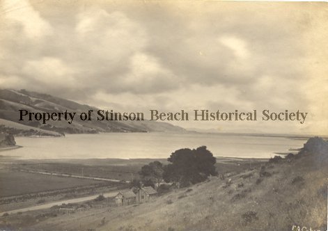 An original photograph taken by Edgar A. Cohen on 6/12/1903 of Bolinas Lagoon environs with hills rising along the lagoon. Junction of Olema-Bolinas Road and Fairfax-Bolinas Road with two ranch houses under trees ( probably, Steel Ranch) in foreground. Sky with clouds and Stinson sandspit jutting out on right mid-ground. Signed in white, E.A.Cohen on lower right corner. On the back: Photographs (stamped) #1612 - Bolinas Bay from Upper End (penciled) Edgar A. Cohen, Alameda Cal. (stamped)