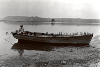 Black and white photograph of McKennon's' skiff floating on the shore of Bolinas Lagoon with Gertrude (Didi) Dunn, in a brimmed hat, sitting inside of boat. The boat is anchored at the stern; the prow is aground on the shore. Shows the end of sand spit and Bolinas Mesa at a distance in the background.