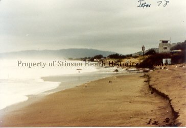 Beach erosion on the public portion of Stinson Beach looking north. The tide is out leaving a foot or two of drop-off in the sand on the southern side of the lifeguard tower. The long view stretches to the residential part of the beach before sea mist obscures the view. The Bolinas peninsula is in the background.