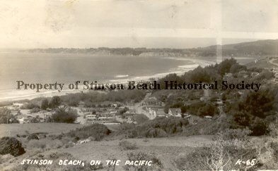 B&W postcard on which is written in white ink "Stinson Beach, On The Pacific" on the bottom and K-65 in the righthand corner. The back of the postcard attributes it as the property of Mary A. Jones. The photo is a panoramic view from the hillside of Stinson Beach, mostly the downtown, and the curvature of Bolinas Bay on a cloudless day.