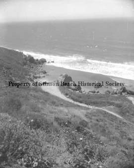 This black and white photograph is a view of the south end of the beach from the cliff above. The foreground is shrubby and shows a path leading from right to left where it drops out of sight . The beach surrounded by boulders is directly below the path with the surf and ocean beyond.