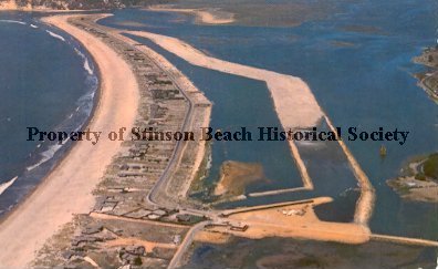 Color aerial photograph of Seadrift development made into postcards. There are 2 of the same postcards. The caption on the back of each postcard reads, "Sea-Drift, located in Marin County, just forty minutes from downtown San Francisco, on the natural sand-split between Stinson Beach and Bolinas. Sea-Drift Lagoon is land-locked. The water level is controlled and protected for sailing and swimming. The Pt. Reyes National Sea Shore lies (just) a few miles to the Northwest. Color photo by Aero Photographers, Inc." It is printed by Natural Color by Mike Roberts, Berkley 2, Calif.