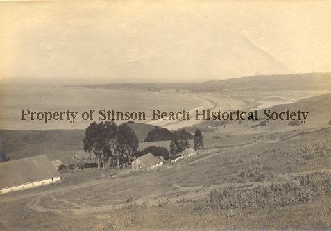 This black and white photographic print, by Edgar A. Cohen, is of White Gate Ranch as it was in 1904. Taken from above the ranch, it shows ranch fences and buildings, the ranch road leading toward the lower Highland area, Stinson Beach beach, the sandspit, Bolinas Lagoon, and Bolinas Peninsula and its coastal hills in distance. There are five ranch buildings including the house under the shadow of some young eucalyptus trees. On the back: #1853 (penciled) Photographs (stamped) On the Clear Day from Steep Ravine Road (penciled) Edgar A Cohen, Alameda, Cal. (stamped) Showing Ocean, Point Reyes, Duxbury Reef, Duxbury Point, The Mesa, Paradise Valley, Bolinas, Bolinas Bay, Bolinas Spit, Dipsea, Willow Camp (penciled)
