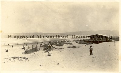 A view of Bolinas Bay (Stinson) Beach looking out from the dunes toward the ocean surf. On the right is a one-story building (Dipsea Lodge; built in 1920 and razed in 1950) nestled in the dunes. There are a couple of people standing on the sand in the foreground and more down along the beach and closer to the water.