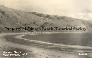 This sepia postcard is a view from Bolinas across the bay to Stinson Beach. A few structures can be seen in the hills and along the beach. Highway 1 is visible coming down to Stinson Beach from the right. 'Stinson Beach from Bolinas, Calif.' is written in white ink in the left hand lower corner. 'Jan 1859' is written in the right hand corner.