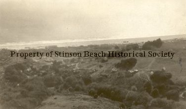 Sepia-toned postcard of an overview of Willow Camp (back of postcard, written in ink, is the name Peggy Pepper and Willow Camp). Mostly it is a scattering of trees and brush and open flat space with the surf in the background. There are structures nestled close to the bushes and some dirt roads/pathways are visible.