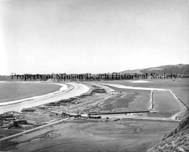 A black and white photograph of the area of Bolinas Lagoon in the process of being filled in in order to create Dipsea Rd. and the Seadrift Lagoon. Part of the causeway between Highway 1 and Seadrift is visible .