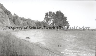 A black and white photo of Bolinas Lagoon at, or near, McKinnon's Landing, described as "Stinson Beach, Lagoon & McKinnon's Place" on lower right hand corner in white letters: The McKinnon's pier to the center- right and a boat that looks like the ferry that used go to Bolinas sits on the shore along the present road to Bolinas. A house on the hill, a cramp of pine trees and the barn that belonged to Easkoot are visible in distance. The lagoon wraps around to the foreground and a couple of stumps of trees are peeking from the water surface.