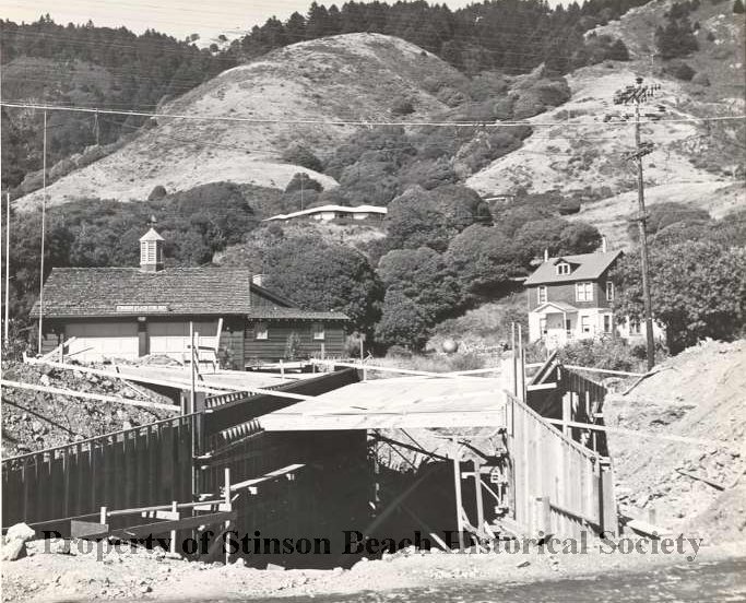 A black and white photograph of the bridge under construction on Highway 1 just north of the firehouse. The lower building on the left is the firehouse; above it on the hill is the newly built Hubbard house; the building on the left is the Lacaze house [originally the Avila dairy farm (pre 1940s)]. See notes