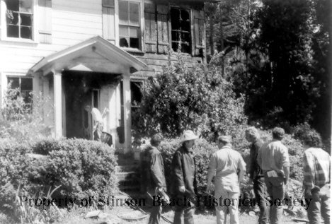In this black and white photograph six men stand at the foot of the entry steps to a house (Easkoot House). Fire chief Kendrick Rand is second from the left wearing a fire helmet. Behind these men another man is entering the front door of the house. He is carrying something with a long handle (a broom?). The right upper portion of the house is charred and discolored from fire. The window is burnt out and all the glass panes are gone. Some of the glass panes in the other two windows visible are gone also.