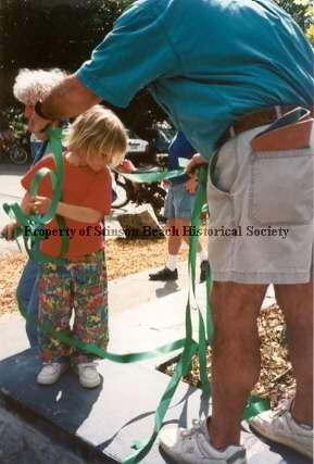 A small blond child in a red t-shirt and blue and red patterned pants holds a green ribbon and is looking at the ground. A man in turquoise shirt and off-white shorts with a cap in his back pocket is helping the child untangle the ribbon.
