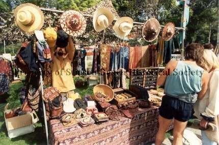 Colorful display table of Balinese-type imported goods: hats, jewelry, sarongs, bags, etc. Two people with backs to camera are examining something in their hands while the man behind the table works on securing his hats to the line.