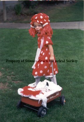 This color photograph is of the little girl in the Raggedy Anne costume described in the previous photo (1997-160-01).She is on grass, walking away from the camera, pulling her wagon and looking over her shoulder at the camera. Her lips and cheeks are painted bright red to match her yarn hair and her dress. She is very cute.