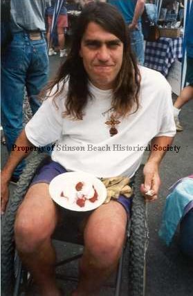 This color photo is of a man in a wheelchair (Mike Mitchell). He is smiling at the camera. His dark hair is long, several inches below his shoulders. He is wearing a white t shirt and purple shorts. He has a plate of strawberry shortcake in his lap and is holding a white plastic fork in his left hand.