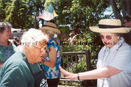 In this color photograph two women face each other in conversation. The woman on the left is Nancy Sullivan; the woman on the right is Janice Cline. Neither is looking at the camera. Rather they seem to be focusing on the ground between them. Nancy wears glasses, a green sweat shirt and a green apron with white writing and figures on it. Her hair is white and she wears it in braids on top of her head. Janice is wearing a brimmed straw hat and a short sleeved blouse and dark glasses. Her left arm is outstretched with the palm down. Behind them to the left are two other women conversing. The one on the left is Barrie Stebbings. There is shrubbery behind the women.
