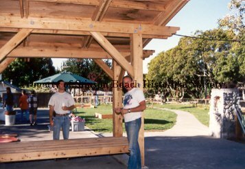 This color photograph shows newly constructed, raw wood structure consisting of a bench with a sheltering roof built above it. Two men in blue jeans and white t shirts are standing by it, one in front of the bench and one behind it. To the right there is a path running back between two lawn beds and at the far right next to the path is a stone drinking fountain. There are some people and umbrellas in the background in the cement area behind the bench.