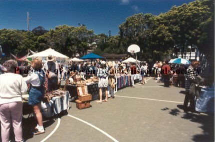 Tables of goods are set up on the basketball court of the Village Green. Some blue and white umbrellas are set up to shade the vendors. People (mostly seen from behind) are inspecting the wares set up on the tables. The center of the court is empty. Trees surround the court.