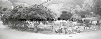 At the corner of Arenal and Calle del Mar, the corner lot is roped off and a pile of rock sits at the corner, as well as a black lab. There is one person with a shovel near a sand pile. Trees line the Calle del Mar side of the (future) park on the left of photo. Rooftops of adjacent buildings are visible behind the wooden fence at the park boundary on the far side.
