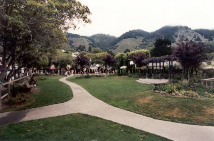 Early morning shot /long view of Village Green I from the SW corner. The cement path forms an inverted Y. The open stage is on the right. Trees and the green hills fill in the background. It is quiet with very few people visible.