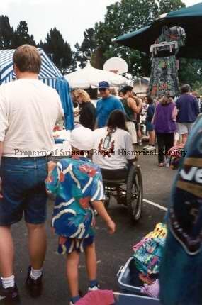 This color photo shows a man in a white t shirt and blue shorts with his back to the camera on the left side of the picture. A child in a blue, white and red print shirt with matching shorts and a white hat is wlaking beside him, holding on to the man's back pocket. Beyond them at the center of the photo is a man in a wheelchair (Michael Mitchell) also moving away from the camera. There are various people in the background as well as a blue and white striped cabana and a white umbrella. The ground is the basketball court with white lines painted on it. Trees are visible behind the people and umbrellas.