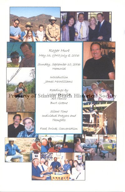 A 8i/2" x 51/2" Xerox printed flyer announcing the memorial gathering for Roger Hurt which took place on September 10, 2006. They are 12 photographs of Roger at various occasions happy and active. See 2009A-100-01, 02.