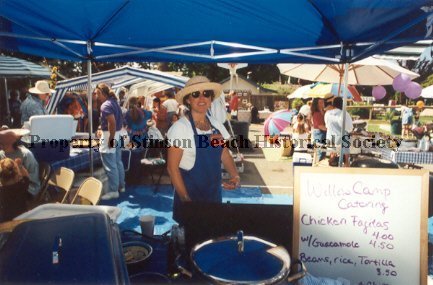 Wendy DiPaolo in straw hat and blue apron over a white t-shirt stands in the middle of her outdoor kitchen under a blue tent. On a white board in front of the serving area is written "Willow Camp Catering" and lists the menu and prices. Next to that is a large pot and BBQ. Beyond are people looking at the displays on the other tables extending the length of the court.