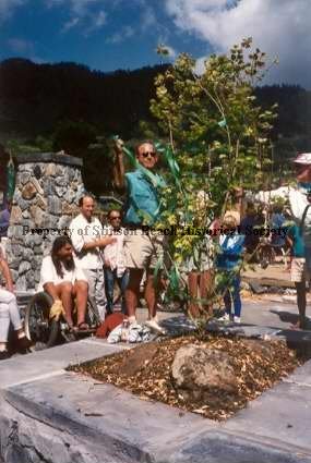 Tree planting/ribbon cutting ceremony at the entrance to Village Green I. Web Otis is holding the green ribbon that encircles the small tree (supported with one hand by Ginny Otis) in a cement planter. Standing in front of the stone entrance looking on is Bill Scott (center) in a white chef's jacket clapping, Michael Knowlton (right) in sunglasses with his hands in his jeans pocket, and Michael Mitchell in a wheelchair. The hillside is dark behind them but the sky is deep blue with wispy clouds.