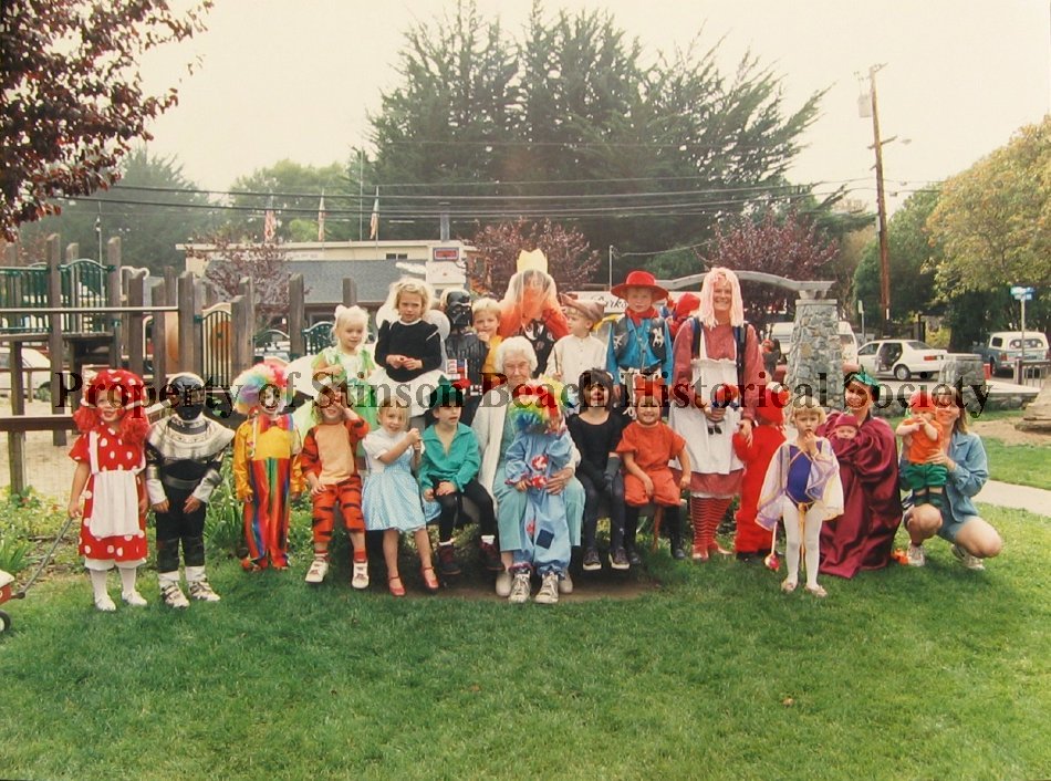 A large color photo print of Stinson Beach preschoolers, with a few parents, and Mrs. Mildred Sadler at the center. It was taken at the Village Green I where 19 preschoolers and 4 parents are all dressed in Halloween Costumes. Trees in the park, part of Parkside Cafe and Village Green playground can be seen in the background.