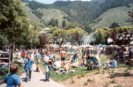 This color photo is of the crowd of people attending the Cuisine on the Green opening. Some are sitting or standing on a lawn and others are walking on the cement path. Beyond the lawn area umbrellas can be seen on the court and smoke rising from a barbecue. There are trees in the background behind which rise the coastal hills.