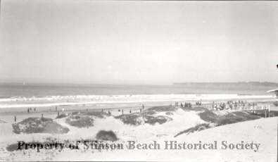 Beach panorama looking from the sand dunes toward the ocean with Bolinas Mesa in the distance. Mostly we see the foliage growing over the dunes, and groups of people on the beach beyond.