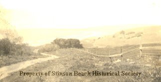 A black and white photo postcard of 1900s looking down toward Stinson Beach and Bolinas from near White Gate Ranch, near Stage Road to Mill Valley through Mt. Tamalpais. The fence to the right separated Rancho Bolinas and Ranch Sausalito Spanish land grants. Capt. Easkoot's's barn is the only visible development.
