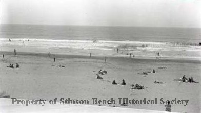 View towards the ocean of a scattering of beachgoers on Stinson Beach - some sitting, some walking, some standing in the surf.