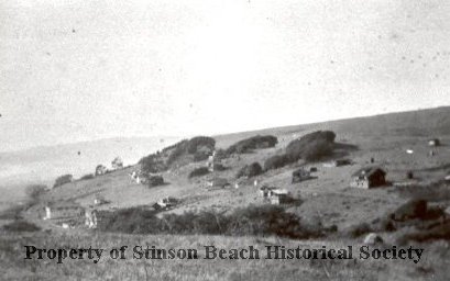 Early photograph of what is now Stinson Beach Old Town. The original Airey Hotel is in the lower left but most of any other structures on Highway One are hidden by trees on the hillside from which the photo was taken. Seventeen other structures are scattered on the rising hillside on the road from Aireys and a number of clumps of naturally occurring trees. A distant ridge and a faint suggestion of the bay is to the middle left of the picture.