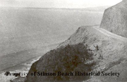 With the shoreline showing a great expanse of ocean with rocks below the cliff on the lower left side of the photograph, a highway is cut into the cliff and turns a corner at the upper right of the picture. In the distance another shoreline extends to close in a bay. The highway is at this point just a narrow dirt road.