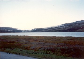 A colored photographic print gives a view across Bolinas Lagoon towards the hills which have extensive patches of snow on the hillsides skirted by Hightway 1.