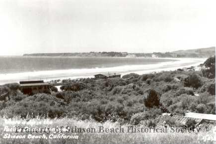 Panorama of Bolinas Bay from the downtown when it was filled with trees and not houses. Onlly a few buildings can be seen near the beach. On the front of the photo, bottom left, is written in white "Where a dip in the Pacific Ocean is enjoyed, Stinson Beach, California."